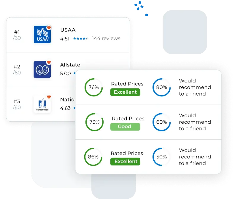 Choose from top customer-rated insurance carriers companies such as State Farm, Progressive, Geico, Allstate, USAA, Liberty Mutual, Travelers, American Family, Auto-Owners, Nationwide, Mercury, Erie, NJM, National General, Amica, The General, Root, Safe Auto, Direct Auto, Safco, Costco, Farm Bureau, AAA, Chubb, Otto, NerdWallet, Plymouth Rock, GoAuto and other top-rated companies.